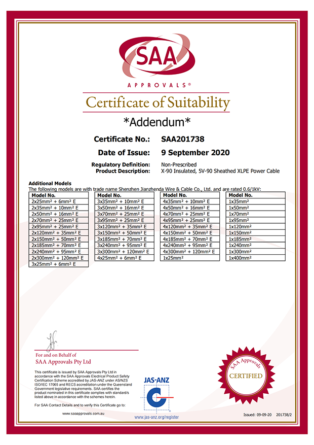 深圳建圳達(dá)電線電纜有限公司,成立于2000年,是一家電線電纜制造商,我們通過了世界各地不同市場的多數(shù)認(rèn)證,如:CCC、RoHS、CB、SAA、TUV、VDE、PSE、BPS、UL、CSA。我們根據(jù)定制產(chǎn)品不斷更新新的認(rèn)證。經(jīng)過數(shù)十年的發(fā)展,我們與來自世界各地的客戶建立了長期的合作關(guān)系。我們曾經(jīng)是菲律賓機(jī)場,,柬埔寨的電力站,美國的醫(yī)院,工廠,埃塞俄比亞的水電站項(xiàng)目。我們是一家值得信賴的電線供應(yīng)商。